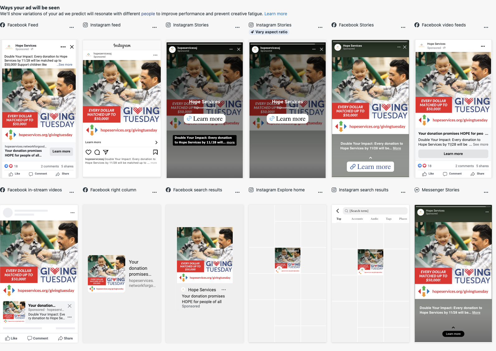 I led the full lifecycle of campaign development, including strategy, creative direction, segmentation, testing, and real-time optimization. Ads featured emotionally compelling impact stories that reinforced Hope’s mission and encouraged donor action. I leveraged winning carousel formats, audience testing, and ongoing performance monitoring to drive results that outperformed the last.
